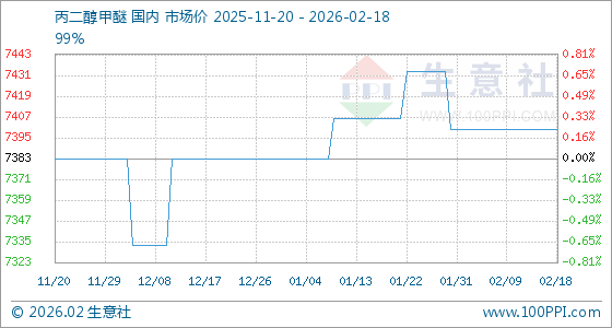 2月18日,生意社丙二醇甲醚基准价为7400.00元/吨,与本月初持平。