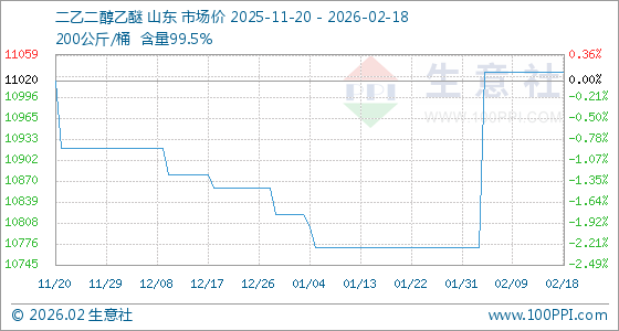 2月18日,生意社二乙二醇乙醚基准价为11033.33元/吨,与本月初(10771.43元/吨)相比,上涨了2.43%。