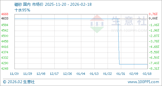 2月18日,生意社硼砂基准价为4283.33元/吨,与本月初持平。