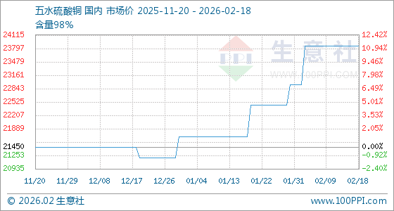 2月18日,生意社五水硫酸铜基准价为23850.00元/吨,与本月初(22933.33元/吨)相比,上涨了4.00%。