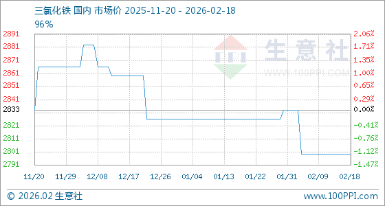 2月18日,生意社三氯化铁基准价为2800.00元/吨,与本月初(2833.33元/吨)相比,下降了1.18%。