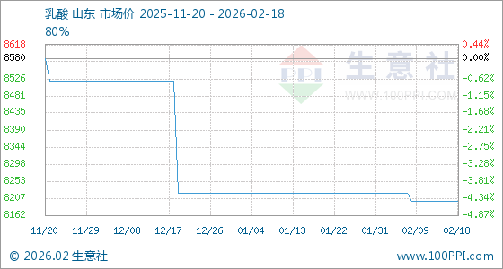2月18日,生意社乳酸基准价为8200.00元/吨,与本月初(8220.00元/吨)相比,下降了0.24%。