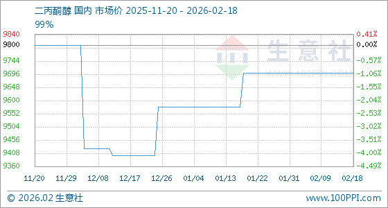 2月18日,生意社二丙酮醇基准价为9700.00元/吨,与本月初持平。