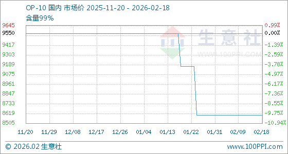 2月18日,生意社OP-10基准价为8600.00元/吨,与本月初持平。