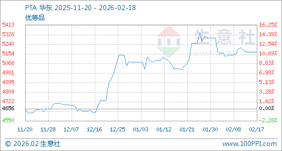 2月18日,生意社PTA基准价为5168.50元/吨,与本月初(5298.83元/吨)相比,下降了2.46%。
