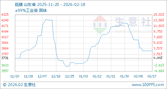 2月18日,生意社硫磺基准价为3833.33元/吨,与本月初(4210.00元/吨)相比,下降了8.95%。