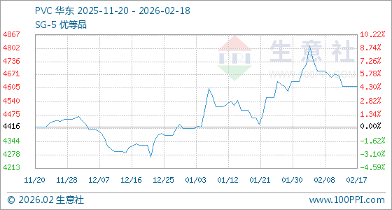 2月18日,生意社PVC基准价为4616.00元/吨,与本月初(4640.00元/吨)相比,下降了0.52%。