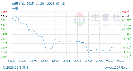 2月18日,生意社白糖基准价为5310.00元/吨,与本月初(5295.00元/吨)相比,上涨了0.28%。