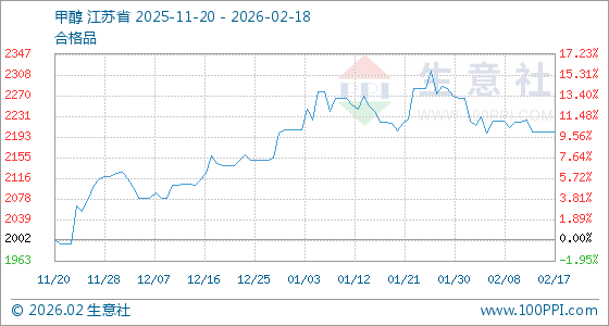 2月18日,生意社甲醇基准价为2201.67元/吨,与本月初(2265.00元/吨)相比,下降了2.8%。