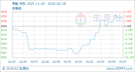 2月18日,生意社苯酚基准价为6500.00元/吨,与本月初(6450.00元/吨)相比,上涨了0.78%。