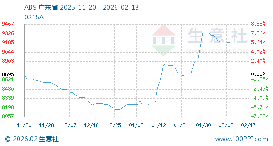 2月18日,生意社ABS基准价为9193.33元/吨,与本月初(9350.00元/吨)相比,下降了1.68%。