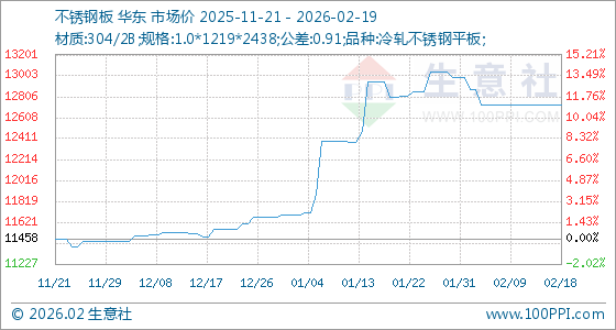 2月19日,生意社不锈钢板基准价为12725.00元/吨,与本月初(12991.67元/吨)相比,下降了2.05%。
