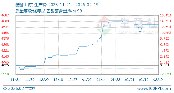 2月19日,生意社醋酐基准价为4565.00元/吨,与本月初(4590.00元/吨)相比,下降了0.54%。