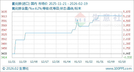 2月19日,生意社氯化钾(进口)基准价为3616.67元/吨,与本月初持平。