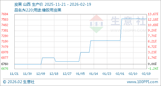 2月19日,生意社炭黑基准价为7600.00元/吨,与本月初(7200.00元/吨)相比,上涨了5.56%。