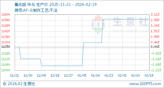 2月19日,生意社氟化铝基准价为11550.00元/吨,与本月初持平。