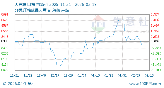 2月19日,生意社大豆油基准价为8354.00元/吨,与本月初(8640.00元/吨)相比,下降了3.31%。