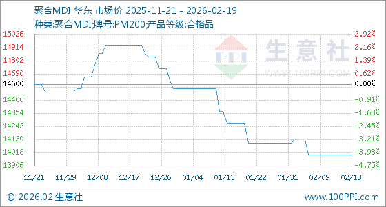 2月19日,生意社聚合MDI基准价为14000.00元/吨,与本月初(14100.00元/吨)相比,下降了0.71%。