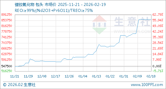 2月19日,生意社镨钕氧化物基准价为860000.00元/吨,与本月初(755000.00元/吨)相比,上涨了13.91%。