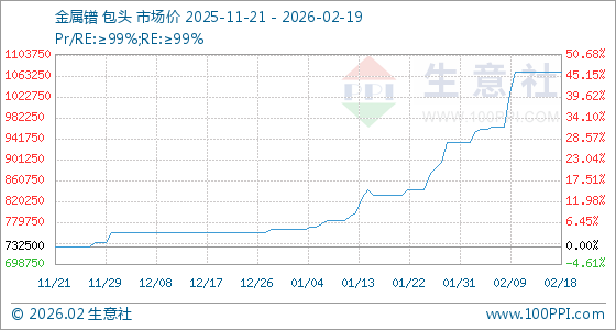 2月19日,生意社金属镨基准价为1070000.00元/吨,与本月初(935000.00元/吨)相比,上涨了14.44%。