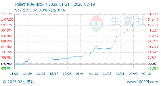 2月19日,生意社金属钕基准价为1085000.00元/吨,与本月初(947500.00元/吨)相比,上涨了14.51%。
