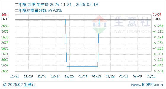 2月19日,生意社二甲醚基准价为3683.33元/吨,与本月初持平。