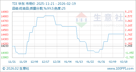 2月19日,生意社TDI基准价为14500.00元/吨,与本月初(14166.67元/吨)相比,上涨了2.35%。