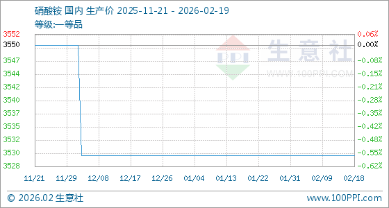 2月19日,生意社硝酸铵基准价为3530.00元/吨,与本月初持平。