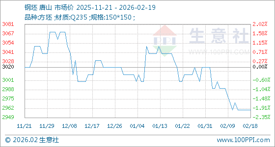 2月19日,生意社钢坯基准价为2960.00元/吨,与本月初(3020.00元/吨)相比,下降了1.99%。