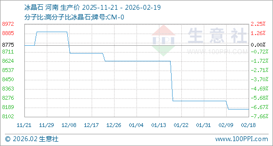 2月19日,生意社冰晶石基准价为8175.00元/吨,与本月初(8250.00元/吨)相比,下降了0.91%。