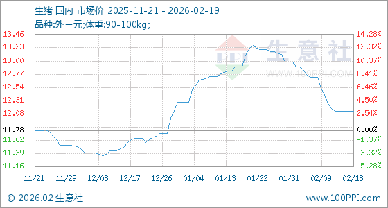 2月19日,生意社生猪基准价为12.12元/公斤,与本月初(12.98元/公斤)相比,下降了6.63%。
