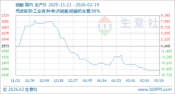 2月19日,生意社硝酸基准价为1460.00元/吨,与本月初(1486.67元/吨)相比,下降了1.79%。