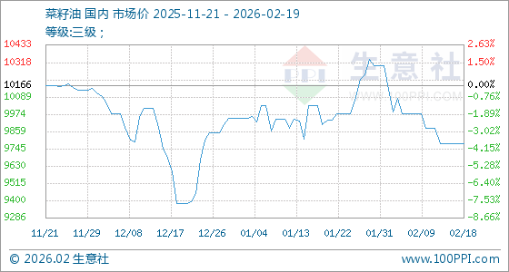 2月19日,生意社菜籽油基准价为9780.00元/吨,与本月初(10298.00元/吨)相比,下降了5.03%。