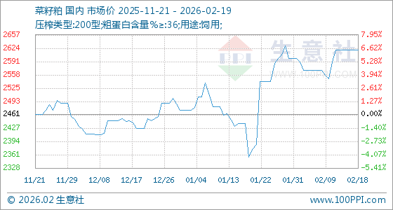 2月19日,生意社菜籽粕基准价为2620.00元/吨,与本月初(2600.00元/吨)相比,上涨了0.77%。