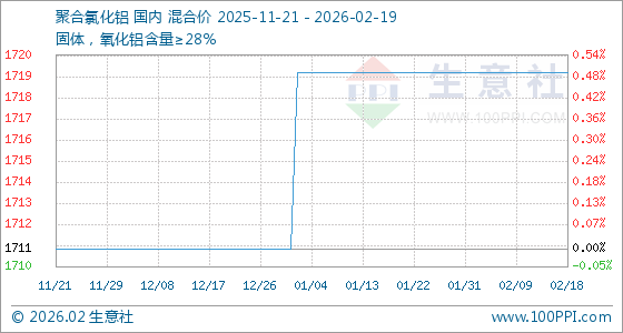 2月19日,生意社聚合氯化铝基准价为1720.00元/吨,与本月初持平。