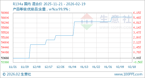 2月19日,生意社R134a基准价为56666.67元/吨,与本月初(56333.33元/吨)相比,上涨了0.59%。
