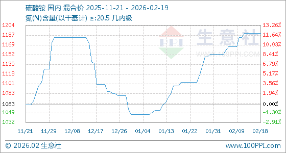 2月19日,生意社硫酸铵基准价为1190.00元/吨,与本月初(1153.33元/吨)相比,上涨了3.18%。