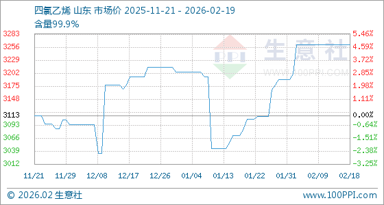 2月19日,生意社四氯乙烯基准价为3261.11元/吨,与本月初(3188.89元/吨)相比,上涨了2.26%。