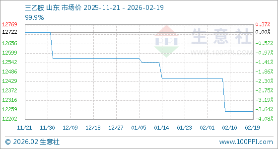 2月19日,生意社三乙胺基准价为12250.00元/吨,与本月初(12444.44元/吨)相比,下降了1.56%。