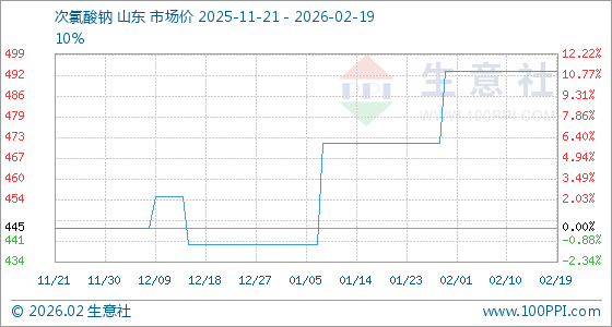 2月19日,生意社次氯酸钠基准价为494.00元/吨 ,与本月初持平。