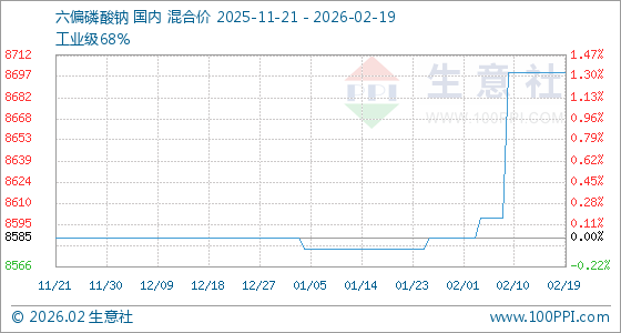 2月19日,生意社六偏磷酸钠基准价为8700.00元/吨 ,与本月初(8585.71元/吨 )相比,上涨了1.33%。