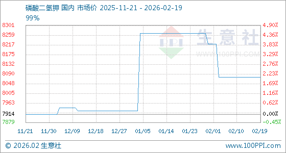 2月19日,生意社磷酸二氢钾基准价为8075.00元/吨,与本月初(8220.00元/吨)相比,下降了1.76%。