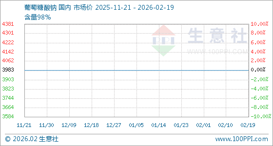 2月19日,生意社葡萄糖酸钠基准价为3983.33元/吨,与本月初持平。