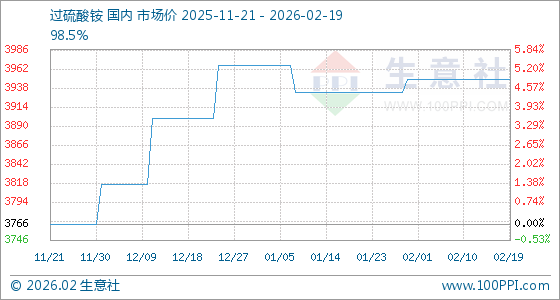 2月19日,生意社过硫酸铵基准价为3950.00元/吨,与本月初持平。
