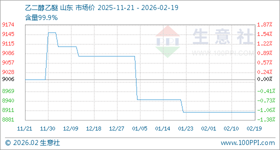 2月19日,生意社乙二醇乙醚基准价为8906.25元/吨,与本月初持平。