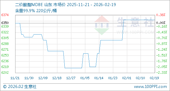 2月19日,生意社二价酸酯MDBE基准价为6360.00元/吨,与本月初持平。