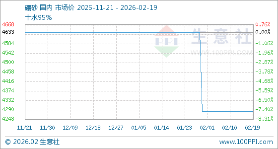 2月19日,生意社硼砂基准价为4283.33元/吨,与本月初持平。