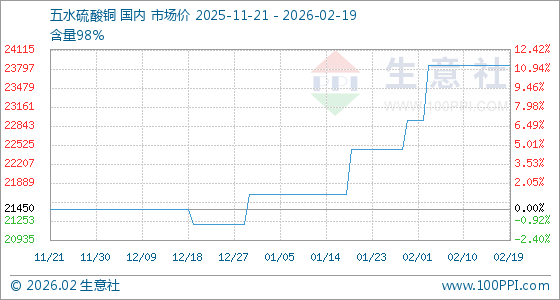 2月19日,生意社五水硫酸铜基准价为23850.00元/吨,与本月初(22933.33元/吨)相比,上涨了4.00%。