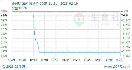 2月19日,生意社正己烷基准价为6975.00元/吨,与本月初持平。