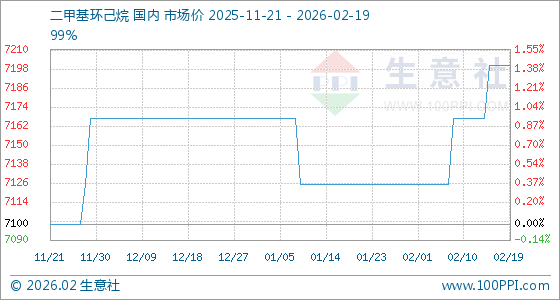 2月19日,生意社二甲基环己烷基准价为7200.00元/吨,与本月初(7125.00元/吨)相比,上涨了1.05%。
